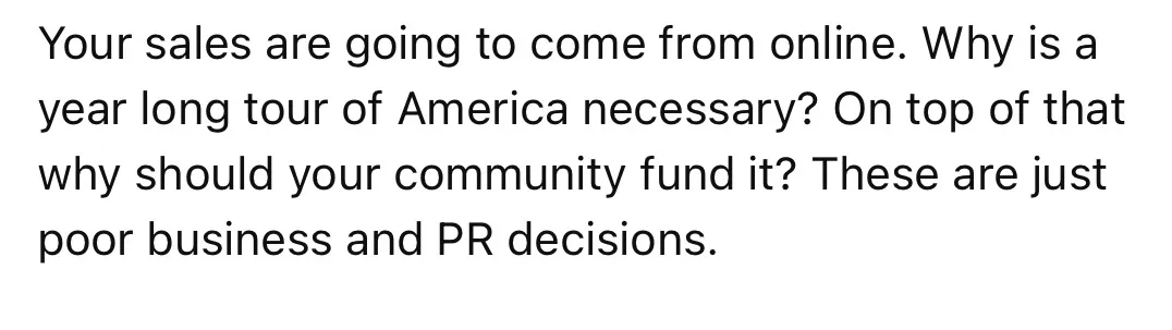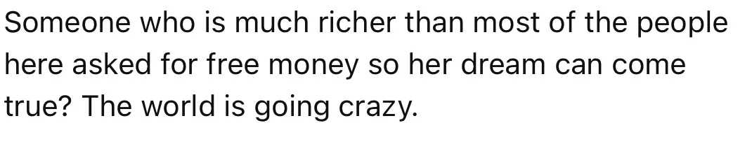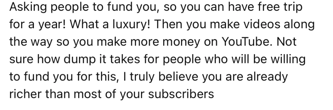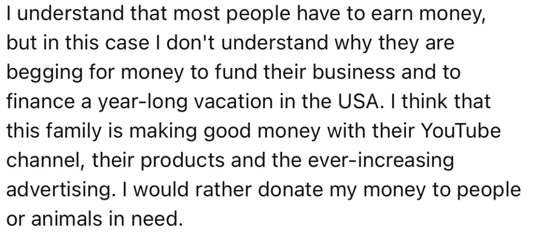 我理解大多數人要賺錢,但我不理解為什麼開眾籌資助長達一年的美國旅行工作,你們一家在油管已經夠賺錢了,有產品,而且廣告也越投越多。我寧願把錢捐給需要的人或者動物。
