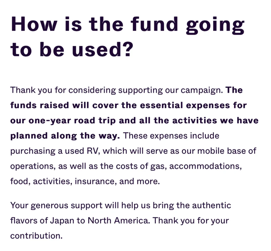 這130萬具體是花在哪裏呢,眾籌頁面顯示是一年醬油推廣路演的基本開銷,包括一輛二手RV、汽油、住宿、餐飲、活動、保險……並且在眾籌頁面寫的是Flexible Goal,也就是這18萬美金也並不是就這18萬美金,如果她想,還可以Raise。