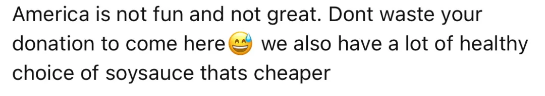 美國不好也不好玩,別“貸款”來這了姐們。我們這也有健康醬油,還比你的便宜。
