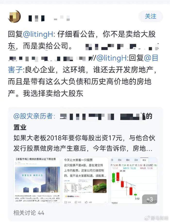 在投資社區“雪球”上,有網友表示:“良心企業,在當前市場環境下,開發高負債、高成本的房地產項目風險太大。我選擇(將股票)賣給控股股東。”