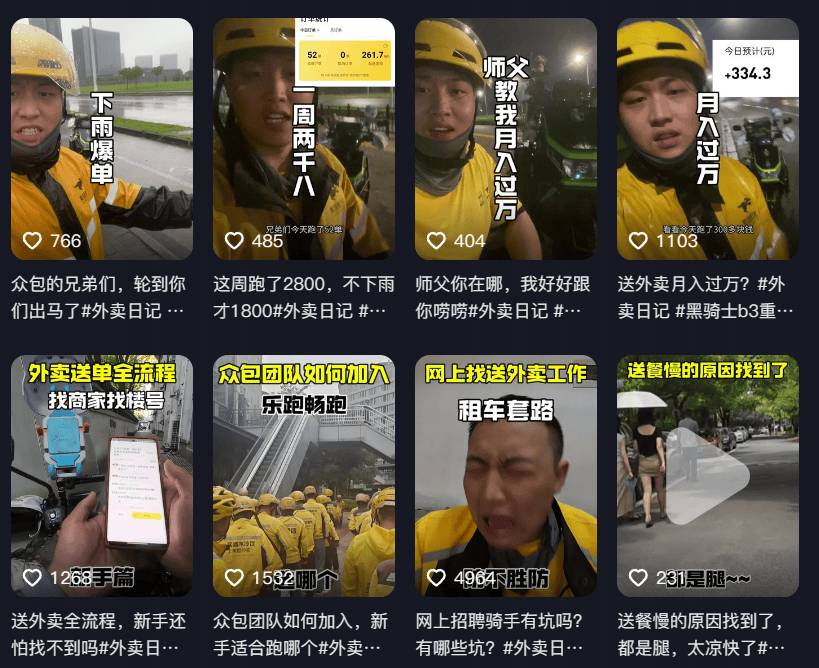中國有上千萬外賣員,當你在短視頻平台刷到大量外賣員賬號時,證明這個賽道已經非常捲了,大浪淘沙,真正能被推送到你眼前、乃至賺到錢的,也只有口才好、有觀眾緣的那幾位。