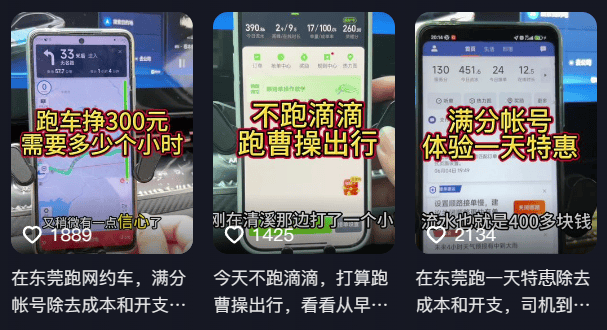近幾年,只需要搜索跑滴滴這個關鍵詞,從跑 “ 一口價 ” 的快車司機到開奔馳 S 的豪車滴滴司機,都會立刻展示在你面前。隨手翻翻,就能知道師傅們一天會跑多久,賺多少,數據還特豐富。