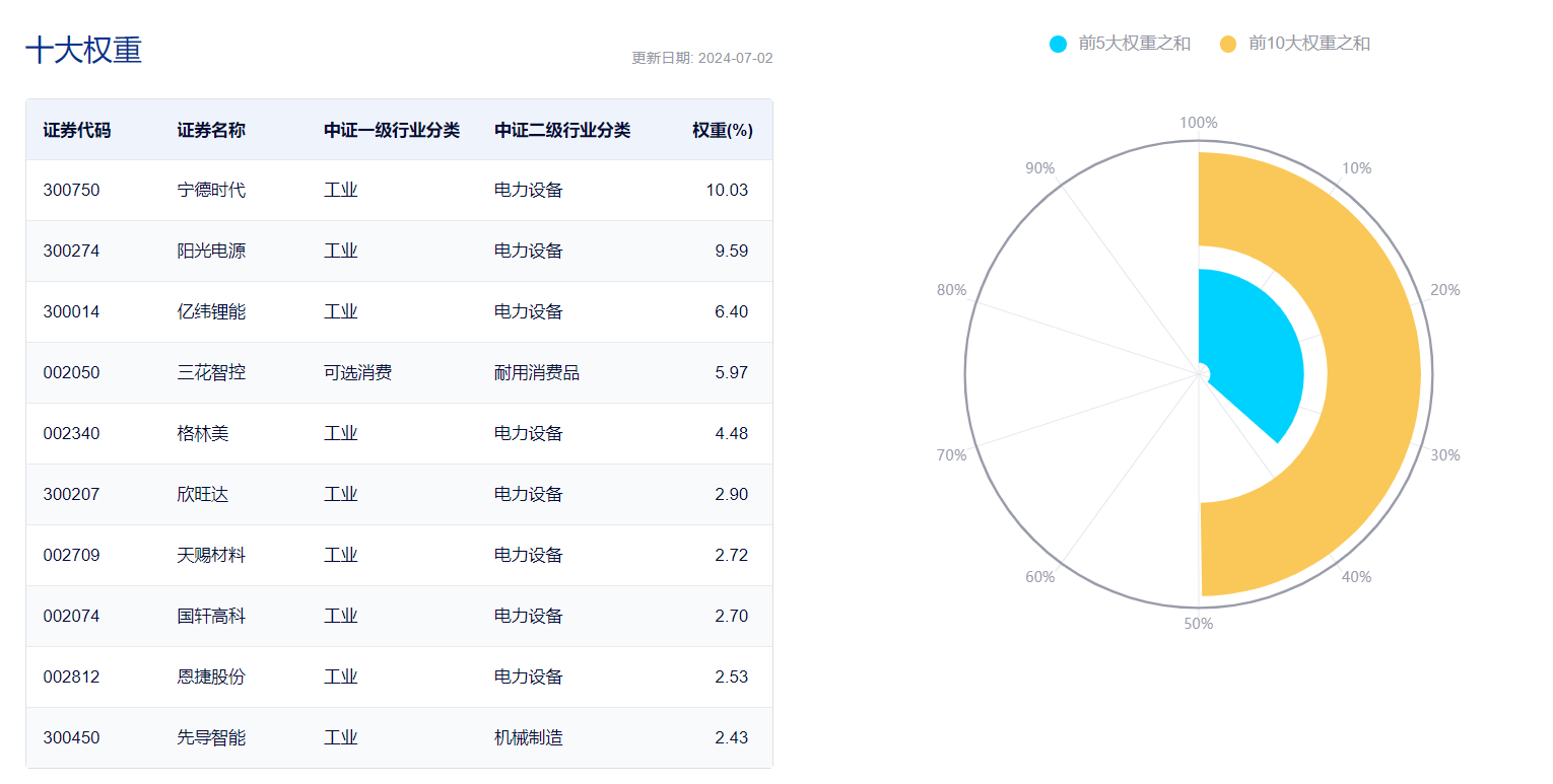 數據顯示,截至2024年7月2日,中證電池主題指數(931719)前十大權重股分別為寧德時代(300750)、陽光電源(300274)、億緯鋰能(300014)、三花智控(002050)、格林美(002340) 、欣旺達(300207)、天賜材料(002709)、國軒高科(002074)、恩捷股份(002812)、先導智能(300450),前十大權重股合計佔比近50%。