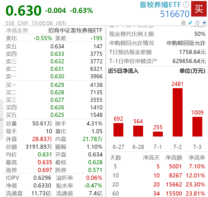 值得關注的是,資金持續買入畜牧養殖主題ETF。根據上交所數據,自5月22日至7月3日,畜牧養殖ETF(516670)份額連續30日增長3.38億份,增幅近40%,增幅位居同主題ETF第一,期間獲得資金淨申購合計約2.3億元。