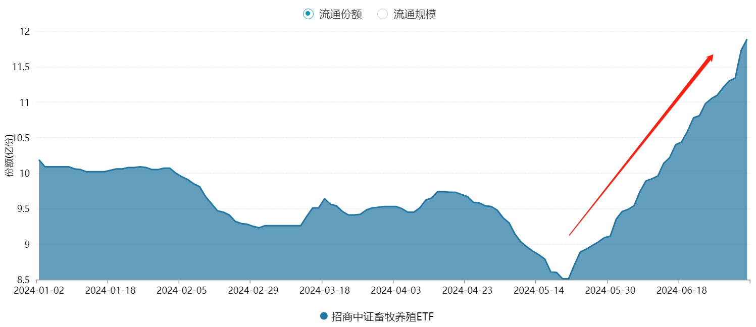 根據上交所數據,自5月22日至7月3日,畜牧養殖ETF(516670)份額連續30日增長3.38億份,增幅近40%,增幅位居同主題ETF第一,期間獲得資金淨申購合計約2.3億元。