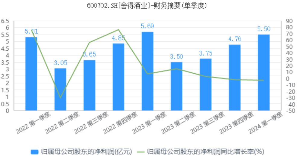 除了白酒銷量旺季不旺這一共性因素之外,財報業績的拉胯也是捨得酒業股價持續低迷的一個重要原因。數據顯示,2024年第一季度,捨得酒業實現營業收入21.05億元,同比+4.13%;實現歸母淨利潤5.50億元,同比-3.35%,這也是捨得酒業自2016年以來首次出現淨利潤連續兩個季度下滑的情形,在白酒上市企業中較為罕見。