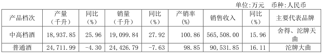 按照產品價格段劃分,捨得酒業主營收入可分為兩大類,一類是以捨得、沱牌天曲為主要品牌的中高檔酒,另一類是以沱牌大麴為代表的普通酒。今年第一季度,捨得酒業中高檔酒實現收入17.25億元,同比增長3.31%,普通酒實現銷售收入2.39億元,同比增長0.85%。