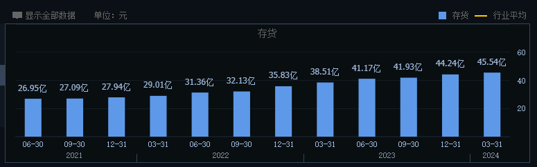 隨着白酒消費的遇冷,存貨問題成為白酒企業共同的壓力,捨得酒業的存貨金額也在不斷增加。截至2024年3月末,捨得酒業存貨金額高達45.54億元,較2020年年末增長20億元,這也是捨得酒業存貨金額連續7個季度出現增長。