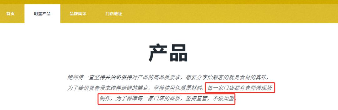 雷達財經注意到,目前在全國擁有上百家門店的鮑師傅只做直營店,暫未開放加盟模式。在公眾號此前發佈的推文中,鮑師傅就曾表示“市面上所有打着加盟電話的均和原創鮑師傅糕點沒有聯繫”。直到現在,鮑師傅在官網上依然宣稱“堅持直營,不做加盟”。