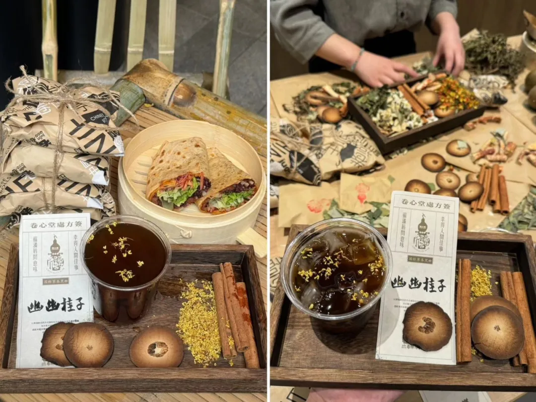 出餐也注重體驗感。做好的飲品蓋上中式茶碗形狀的杯蓋,放在木質托盤上,旁邊撒上各種草藥做裝飾,還附上老黃曆樣式的產品介紹卡。捲餅則被裝在紙質長筒盒裏,用麻繩捆着,乍一看像中式畫軸。
