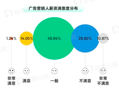 有一份《廣告營銷行業薪酬報告2024版》顯示,對薪資不滿意的廣告人佔比達4成,僅15%的人對當下的薪酬表示滿意。