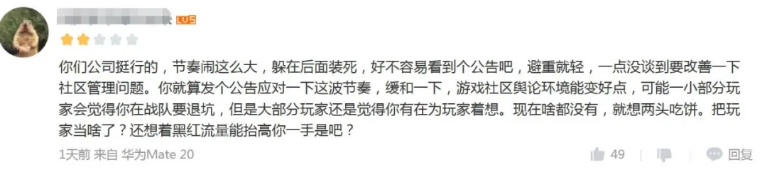 可以看出,雙方的要求提到這個份上,幾乎不存在調和空間了,廠商站一邊就意味着放棄另一邊。當然廠商也可以選擇哪邊都不站(俗稱裝死),運氣好風頭過去一切照舊,但也可能演變成同時被雙方拋棄徹底崩盤。這就讓如今的一般向遊戲運營宛如渡劫。