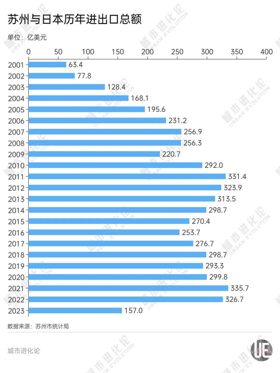 2001年,蘇州與日本的進出口總額為63.4億美元,兩年迅速翻倍,突破百億美元大關(2003年達到128.4億美元),2006年再創新高,達到231.2億美元,2011年站上“300+億美元”台階(331.4億美元)。