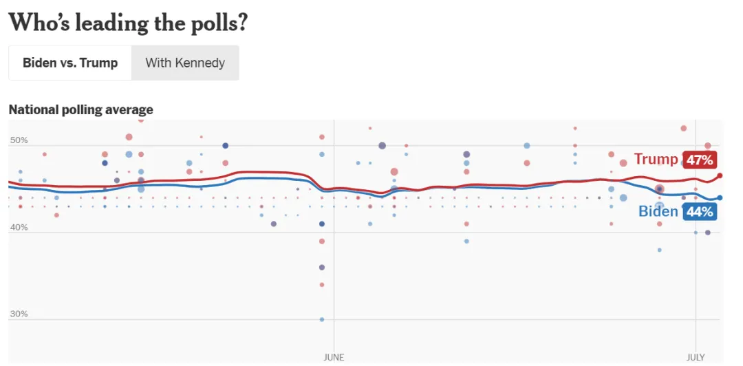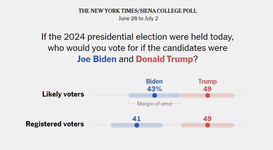 不過,白宮的回應,並未能挽救拜登低迷的民意。紐約時報剛剛出爐的最新數據顯示,在Siena民意調查中,拜登和前總統川普的差距進一步拉大,川普在全美潛在選民中的支持率以 49% 比 43% 領先拜登。
