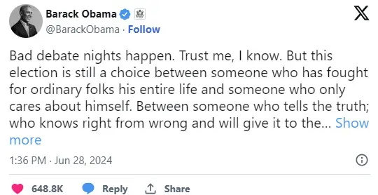 美國前總統奧巴馬也在社交平台X上發文公開支持拜登:“糟糕的辯論是會發生的,相信我,我很瞭解。”