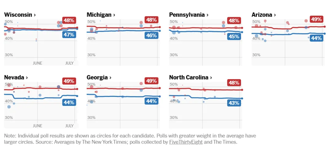 在六大搖擺州的調查中,川普的支持率都比拜登高。