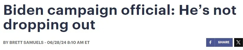 當天,拜登競選辦公室立馬闢謠:他不會退出。
