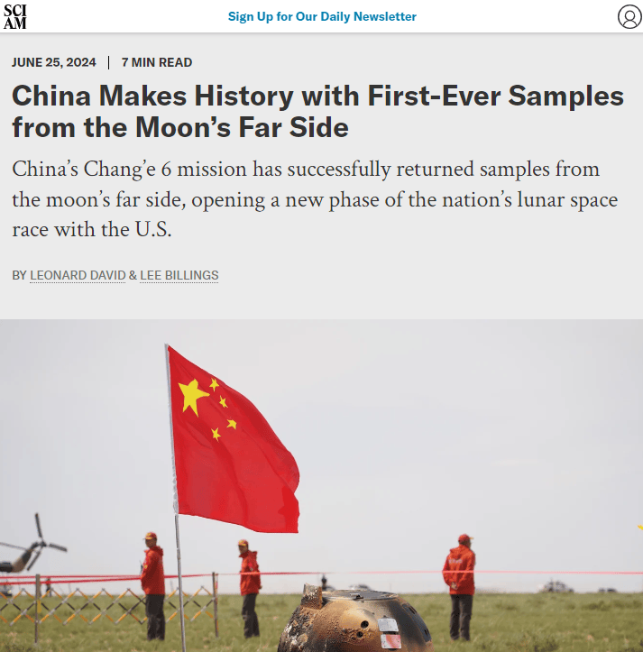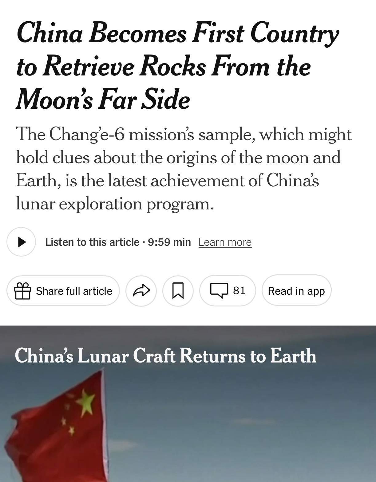 6月25日,中國探月工程嫦娥六號順利從月球背面帶回1935.3克的月壤。我一直在關注國外媒體對這件事情的報道,這是少有的國外的主流媒體沒有對這件事情加以負面報道,也沒有用上陰陽怪氣的寫法,譬如,“事情很成功,但是代價是什麼?”。當然也沒有什麼太多的溢美之詞,基本上就是客觀報道。