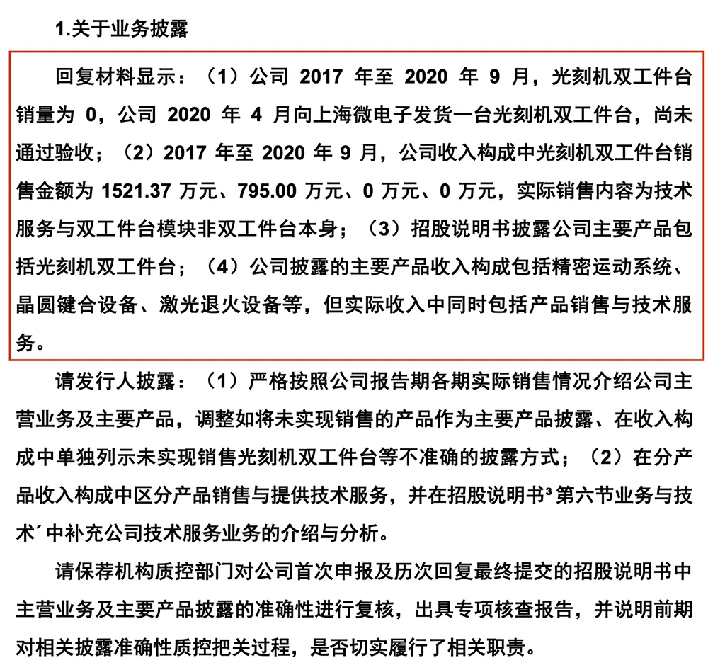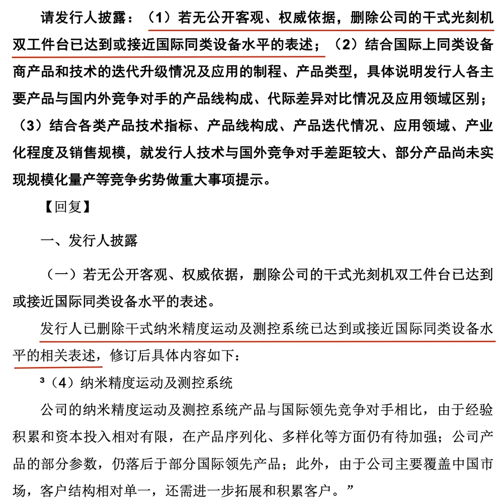 上交所要求對華卓精科嚴格按照實際銷售情況介紹公司主營業務及主要產品,並要求華卓精科“若無公開客觀、權威依據,刪除公司的乾式光刻機雙工件台已達到或接近國際同類設備水平的表述”,最終華卓精科刪除了乾式納米精度運動及測控系統已達到或接近國際同類設備水平的相關表述。