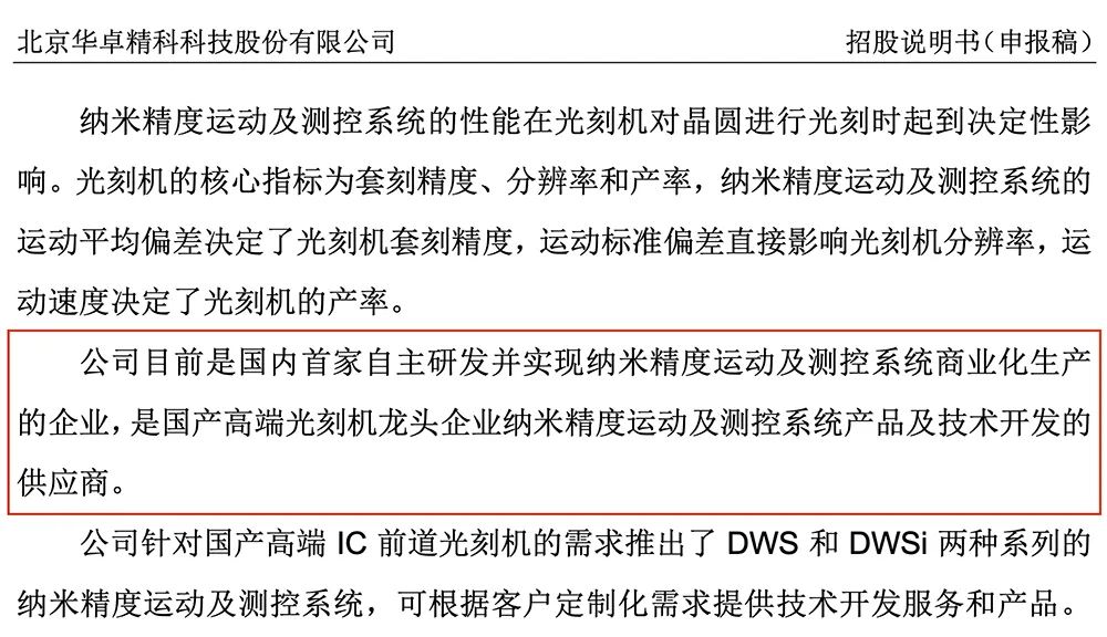 在申報稿中,華卓精科稱自己是“國內首家自主研發並實現納米精度運動及測控系統商業化生產的企業”、“是國產高端光刻機龍頭企業納米精度運動及測控系統產品及技術開發的供應商”。
