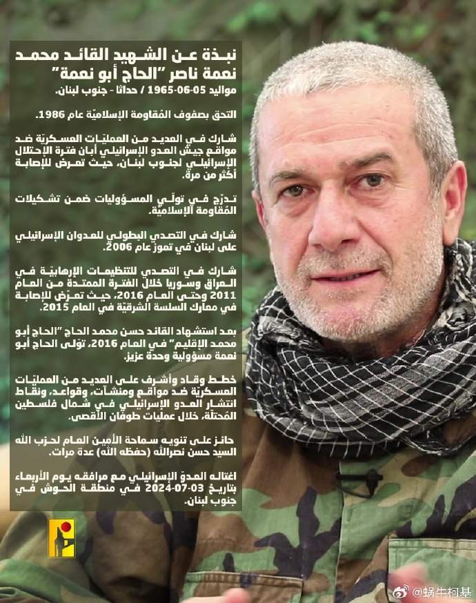 🔶️6月12日,以色列國防軍殺死了負責黎以邊境東部地區的納斯爾師指揮官。