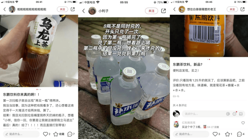 東鵬飲料復刻了過去的打法,“大玩”開蓋贈飲的“高中獎率”玩法。包括“烏龍上茶”“補水啦”“菊花茶”等飲品,在社交平台上都被消費者曬出有開蓋贈飲的“超高中獎率”。