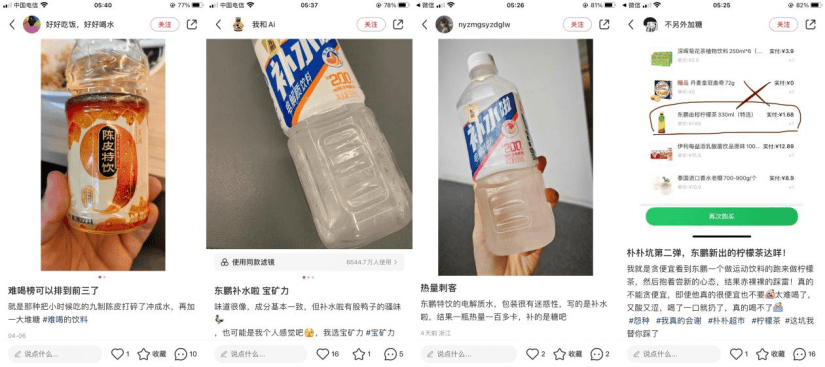 即便是重金聘請青年演員於適為代言人的東鵬“補水啦”,也被消費者拿來與“某特力”對比,並表示其“補水啦”有股味道,或直言其一瓶熱量一百多卡,“補的是糖吧”。