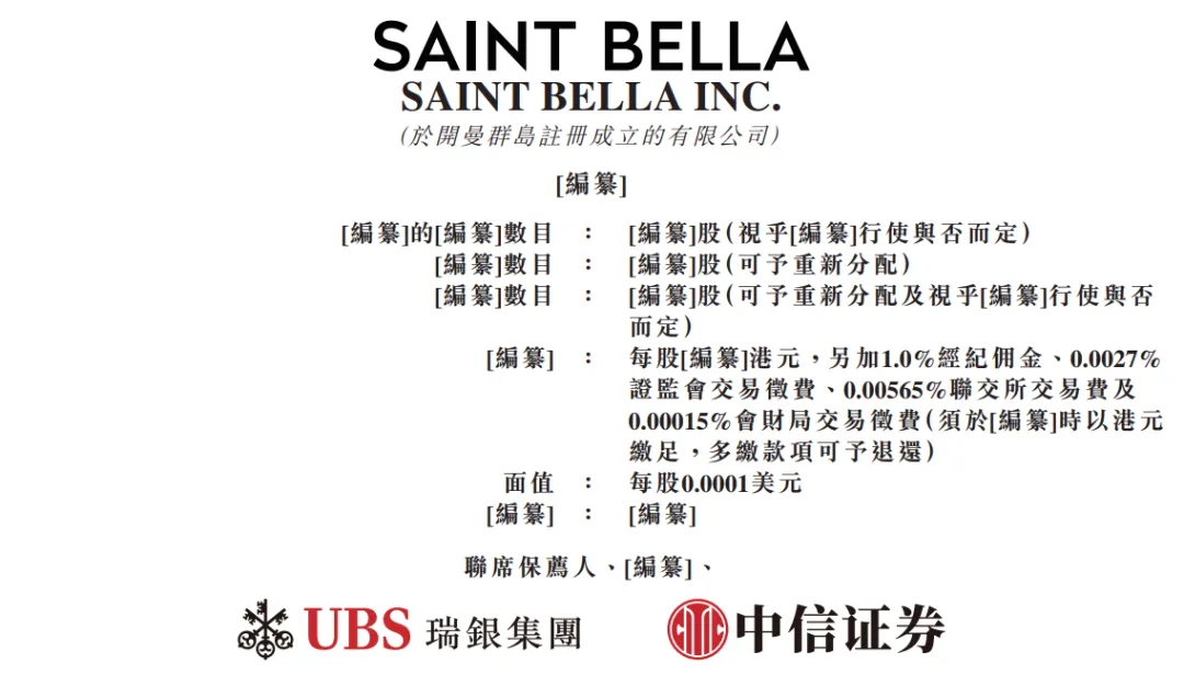 據港交所近日披露,SAINT BELLA INC. (聖貝拉)向港交所主板提交上市申請,瑞銀集團和中信證券擔任聯席保薦人。