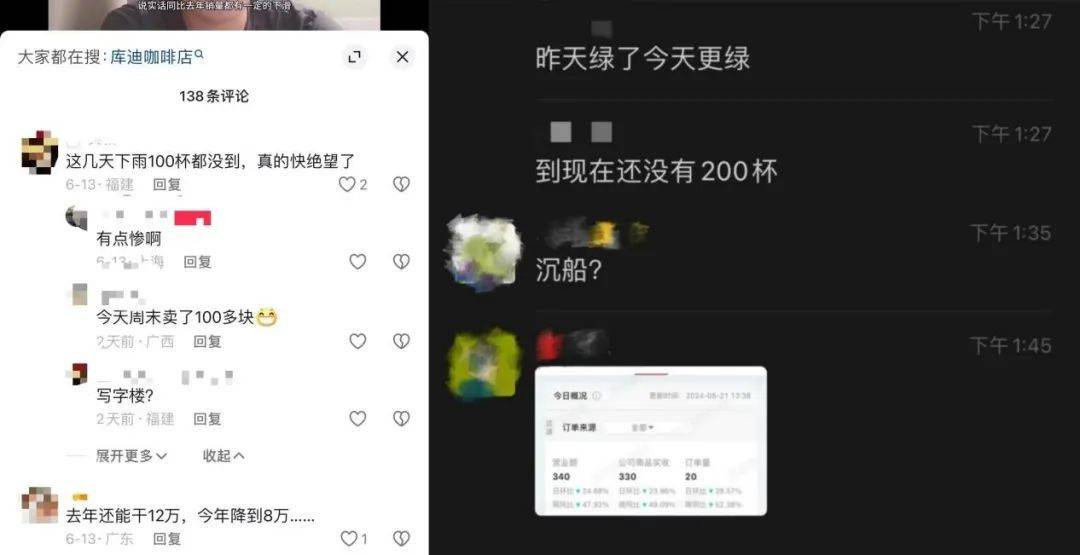 這位聯營商還不是庫迪旺季杯量慘淡的唯一“受害者”,在這條視頻的評論區,就有同為庫迪聯營商的人吐槽,這幾天下雨連100杯都沒賣到,同時表示“真的快絕望了”。還有不止一位聯營商在內部羣裏曬出的“不足200杯”“訂單量20”等並不樂觀的日杯量。
