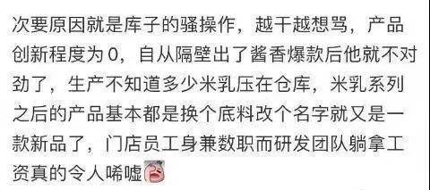 有庫迪門店員工在小紅書上爆料:“產品創新程度為0,生產不知道多少米乳壓在倉庫,米乳系列之後的產品基本都是換個底料改個名字就又是一款新品了”,還發出了“門店員工身兼數職,而研發團隊躺拿工資真的令人唏噓”的感慨。