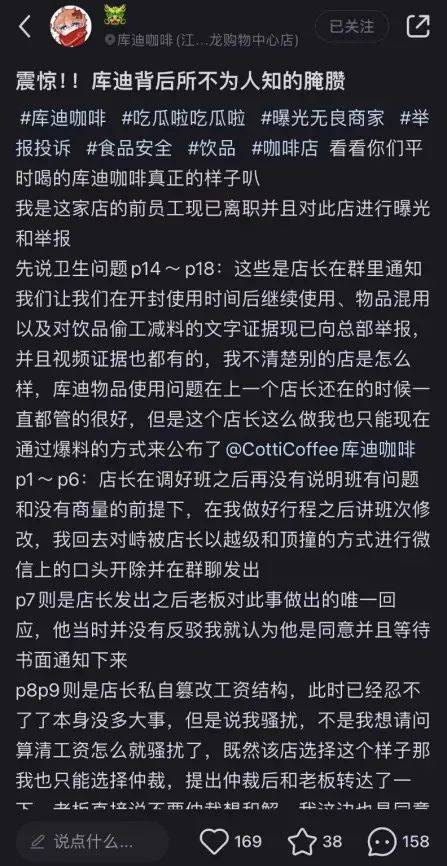 有庫迪前員工在小紅書發帖揭露其所在門店的多個問題,包括但不限於:在物料開封過了使用效期後繼續使用、物品混用、對飲品偷工減料等。