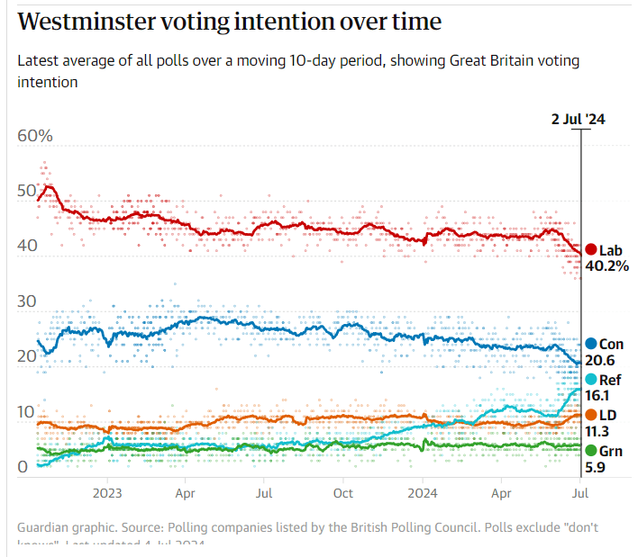 在英國連續執政了14年的保守黨現在真續不住了。英國大選投票今天正式開始,在民調數據中,保守黨的得票率預計落後工黨近20%。在英國下議院的650個席位中,工黨可能會獲得超過400個席位,領先其他政黨總計超過200個席位。這個數據被英國媒體稱為,工黨的破歷史紀錄級大勝。