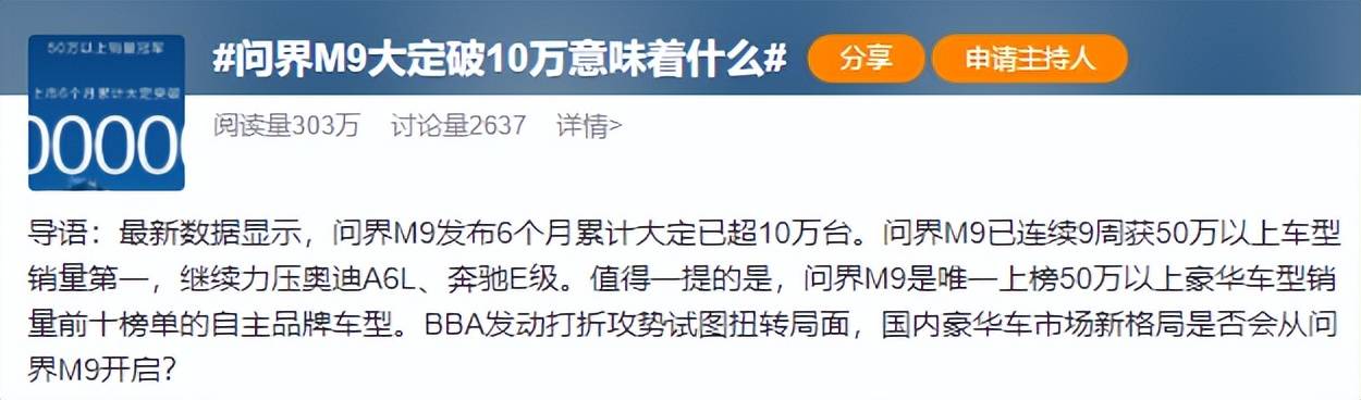 除了在智能駕駛領域對標特斯拉,華為還向BBA、保時捷等傳統豪華車企發起了衝擊。5月,問界M9銷量位居 50 萬元以上第一,超越了BBA等傳統豪華車,隨後6個月累計大定超10萬輛,引起了車圈的廣泛討論和傳播。