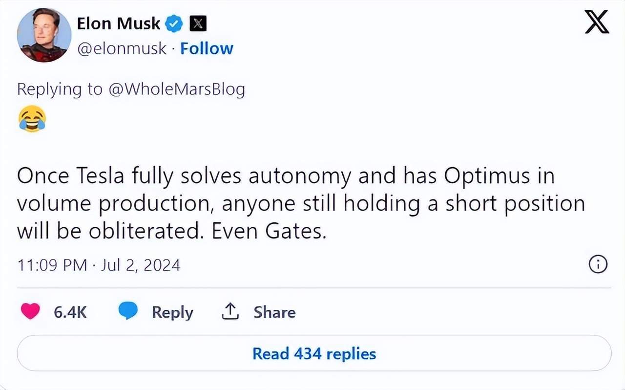 “一旦特斯拉完全解決自動駕駛問題並量產Optimus,任何空頭都將被消滅,即使是比爾-蓋茨也不例外。”7月2日,馬斯克再次在社交媒體X上畫下了這樣的“大餅”。