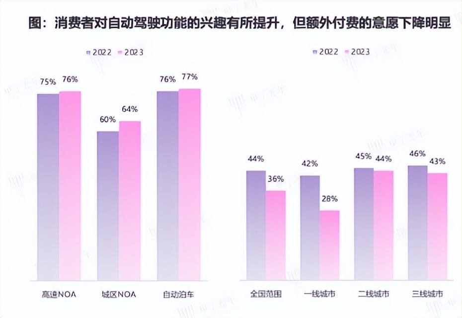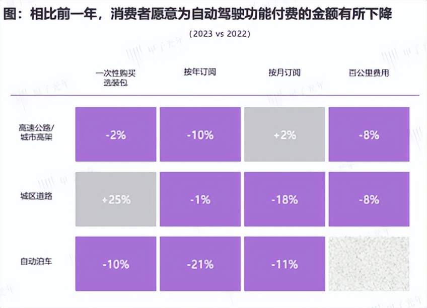 事實情況是,在汽車行業日益激烈的“內卷”競爭中,消費者在購車時面臨一種內在的矛盾現象:儘管對汽車的“智能化”和自動駕駛功能的興趣與期望在上升,但他們的支付意願和金額卻普遍呈現下降趨勢。