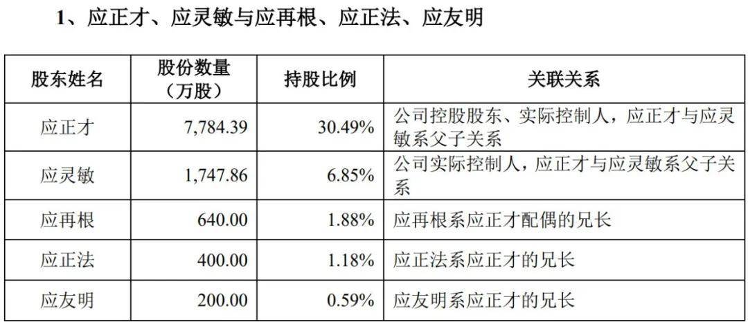 截至招股説明書籤署之日,應正才與應靈敏父子直接或間接持有公司37.35%股份。其中,應正才擔任公司董事長、應靈敏擔任副董事長,為公司實際控制人。