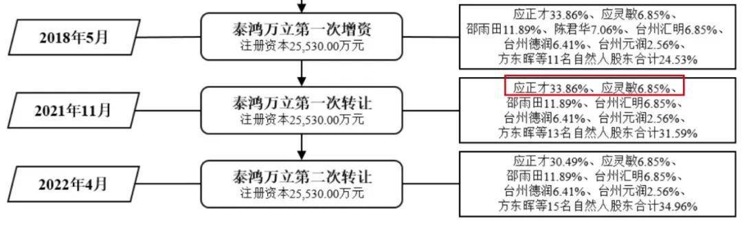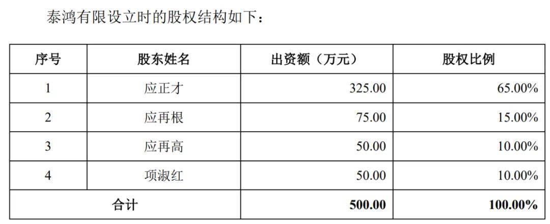 因此,2005年8月,應正才、應再根、應再高、項淑紅決定共同出資設立泰鴻萬立的前身泰鴻有限,註冊成本500萬元。其中,應再根、應再高是應正才配偶的兄弟,項淑紅是應正才兄弟的配偶。