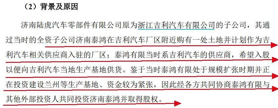 而濟南泰鴻在吉利汽車廠區附近購有一處土地並計劃作為吉利汽車相關供應商入駐的廠區。泰鴻有限當時是吉利汽車的供應商,希望入股以便向吉利汽車當地生產基地供貨。