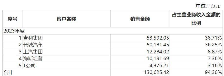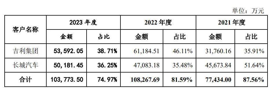 其實,直到2009年,公司才與吉利建立合作關係,並將其發展成了數一數二的大客户。2021年至2023年,吉利貢獻了35.91%、46.11%、38.71%的主營業務收入。