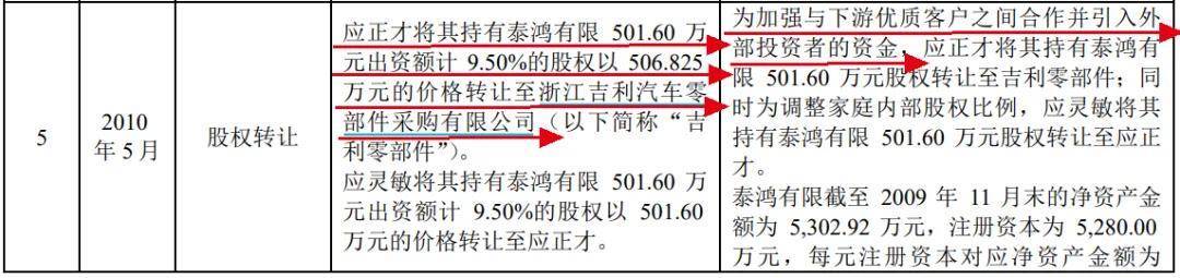 2010年5月,應正才將其持有的泰鴻有限501.60萬元出資額以506.83萬元的價格轉讓至浙江吉利汽車零部件採購有限公司(以下簡稱“吉利零部件”)。