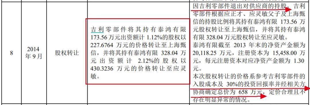 2014年9月,吉利零部件將其持有的泰鴻有限173.56萬元出資額以 227.68萬元轉讓至上海甄信、328.04萬元出資額以430.32萬元轉讓予應正才之子應靈敏,合計套現658萬元,投資回報率30%。