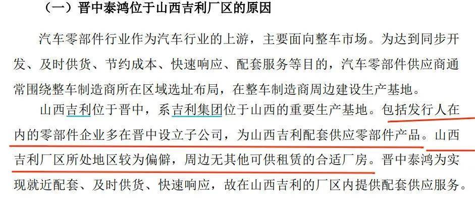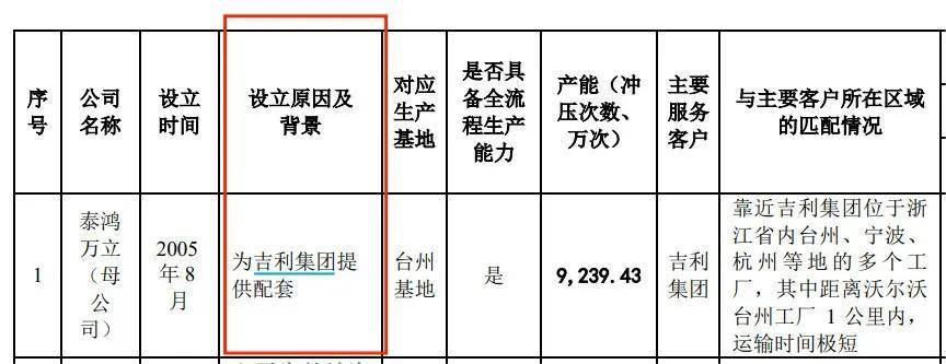 而泰鴻萬立的子公司設立在吉利汽車廠區內的情況並不罕見。例如,公司全資子公司晉中泰鴻就位於山西吉利廠區併為吉利配套供應零部件產品。