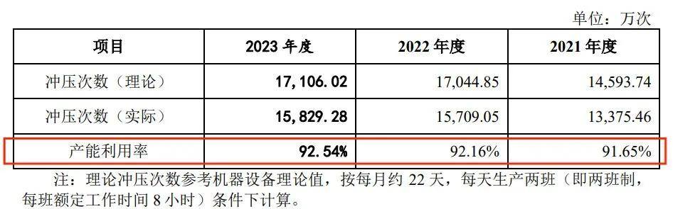 2021年至2023年,公司的產能利用率分別為91.65%、92.16%、92.54%,僅微弱增長,且並未達到100%。