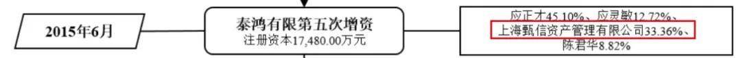在2015年6月的最後一次增資後,上海甄信持有泰鴻有限33.36%股權,僅次於應正才、應靈敏父子,是公司第二大股東。