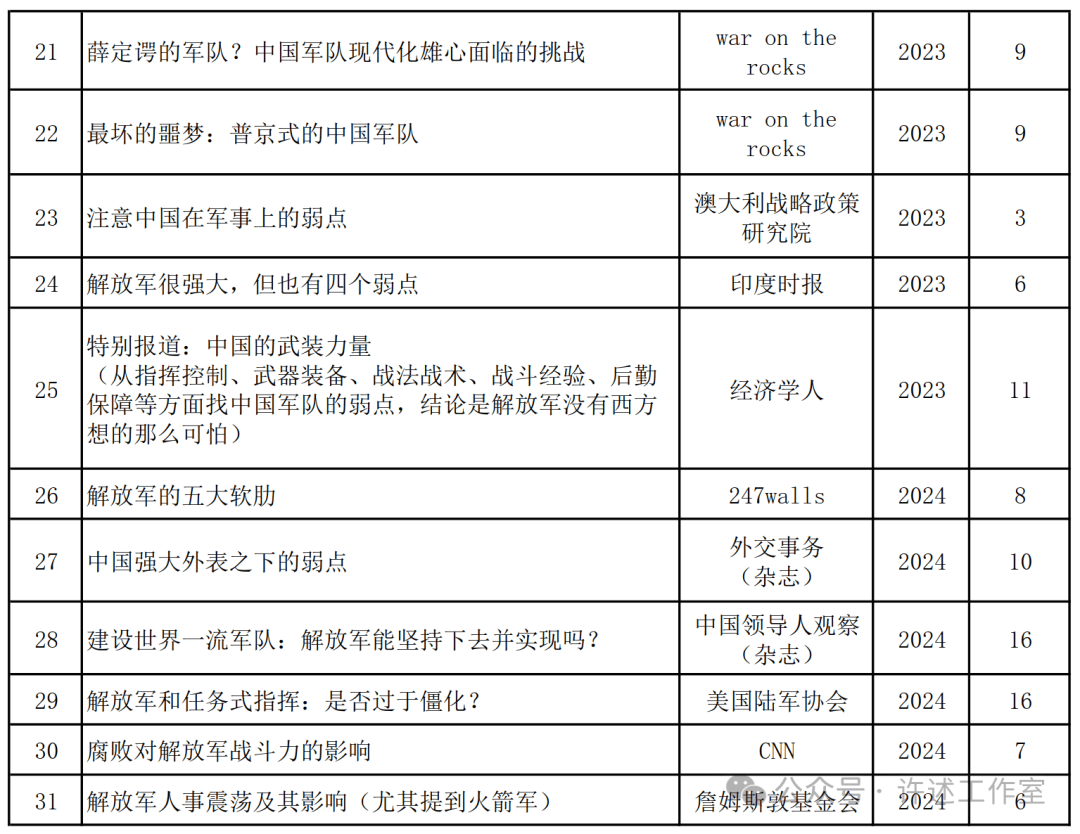 從時間上看,近年來研究中國軍隊弱點的材料逐年增加。就本工作室的上述統計來看,2023年和2024年是數量最多的,預計未來還有進一步加強的趨勢。