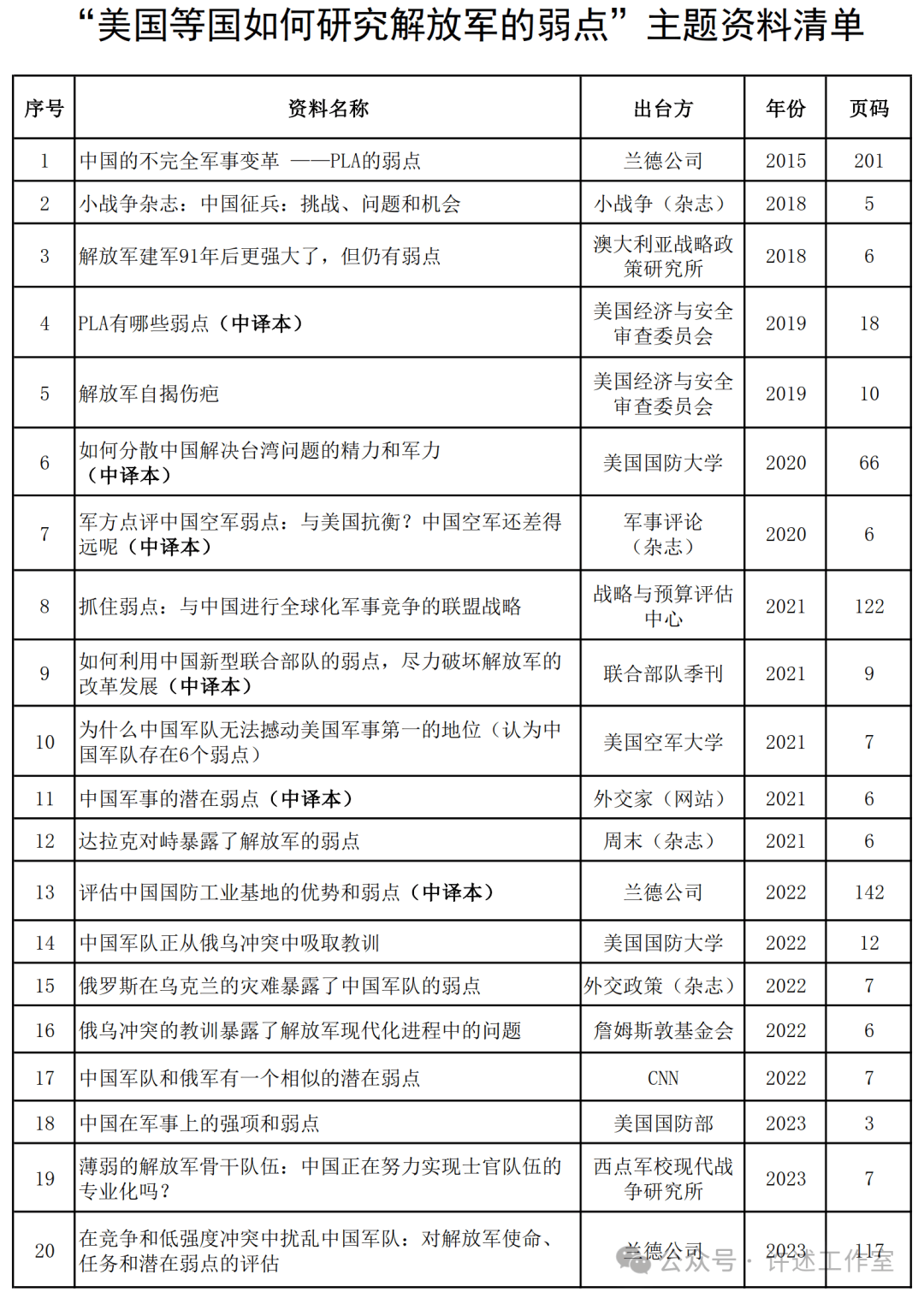 現在,美國已經不滿足於在戰時再去找中國軍隊的弱點,工作提前展開了。當中國軍隊於2015年啓動史無前例的改革之際,美國知名智庫蘭德公司出台了一份報告,對中國軍隊的問題和弱點進行全面調研評估。這份報告長達201頁,在美國國內和中國都有很大的影響。此後,美國並未就此停止對中國軍隊弱點的觀察與評估,甚至其他國家也加入進來。下面是2015年至今近10年國外對中國軍隊弱點進行分析的材料(不完全統計):
