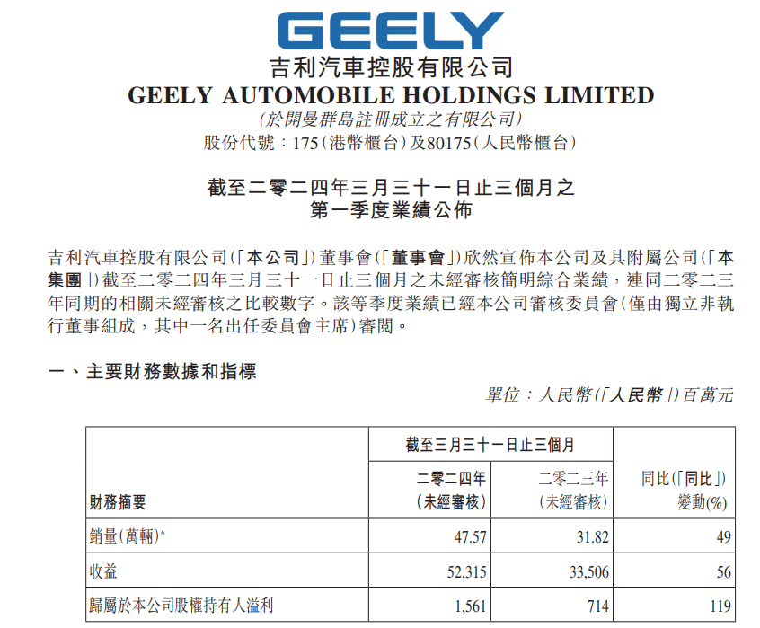 據財報,2024年第一季度,吉利汽車實現營收523億元,同比增長56%;實現歸屬於上市公司股東的淨利潤15.61億元,同比上漲119%;整體銷量達47.57萬輛,同比增長49%,增速跑贏大盤。