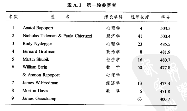 邀請博弈論專家,也包括心理學、經濟學、政治學、數學和社會學背景研究員、人士各自提供一套策略算法,進行計算機模擬。