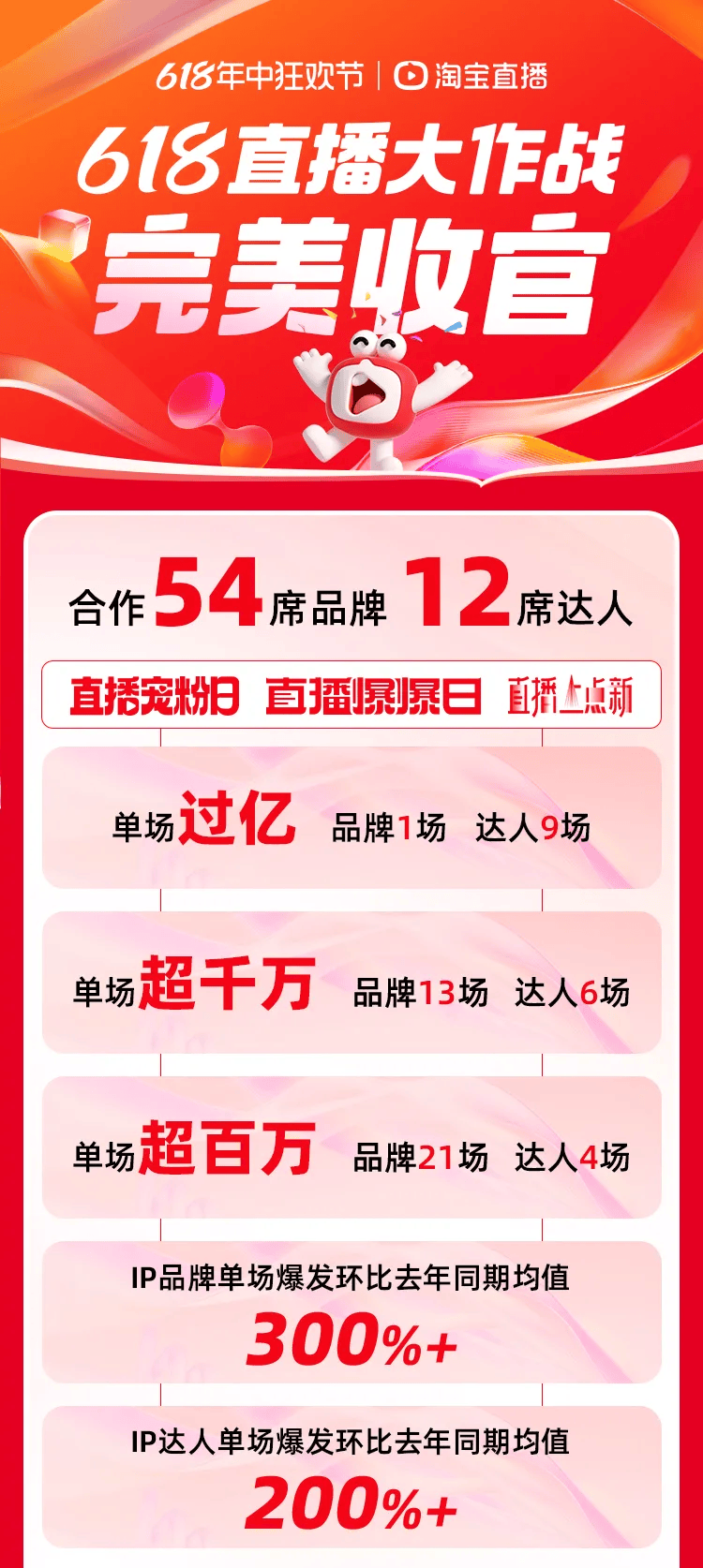 就在當日,淘寶直播公佈的618直播大作戰成績單稱:本次直播大作戰共合作54席品牌、12席達人,其中有1場品牌和9場達人單場成交破億,13場品牌和6場達人單場成交破千萬,21場品牌和4場達人單場成交過百萬。