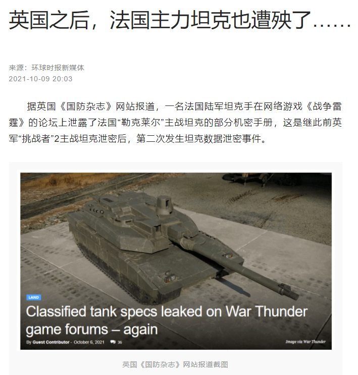 2021年,一名英國“挑戰者”2主戰坦克的車長為了證明“挑戰者”2坦克的性能應當優於遊戲中的數據,主動在官方論壇上傳了“挑戰者”2坦克的技術手冊。隨後,法國坦克手也不甘示弱,也貼出了“勒克萊爾”主戰坦克的資料。這兩起事件引發了不小的爭議,不少吃瓜羣眾第一次知道——原來玩遊戲也能泄密啊!